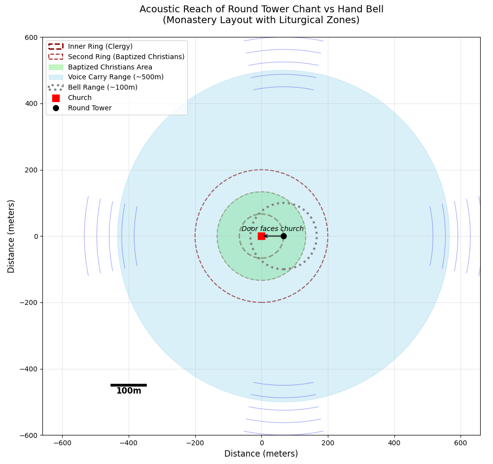 The following spatial analysis demonstrates the acoustic superiority of vocal projection from Round Towers compared to handheld bells, supporting the liturgical interpretation of tower function: