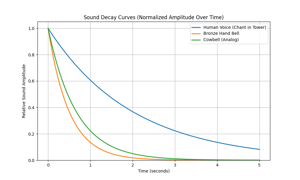 This analysis demonstrates that the human voice in the tower chamber maintains sustained amplitude for several seconds (k = 0.5), while early medieval Irish handbells exhibit rapid decay (k = 2.0). The chamber’s 2.1-second reverberation time specifically enhances the vocal sustain, creating optimal conditions for responsorial chanting where the congregation needs time to hear, process, and respond to the psalm leader’s call.